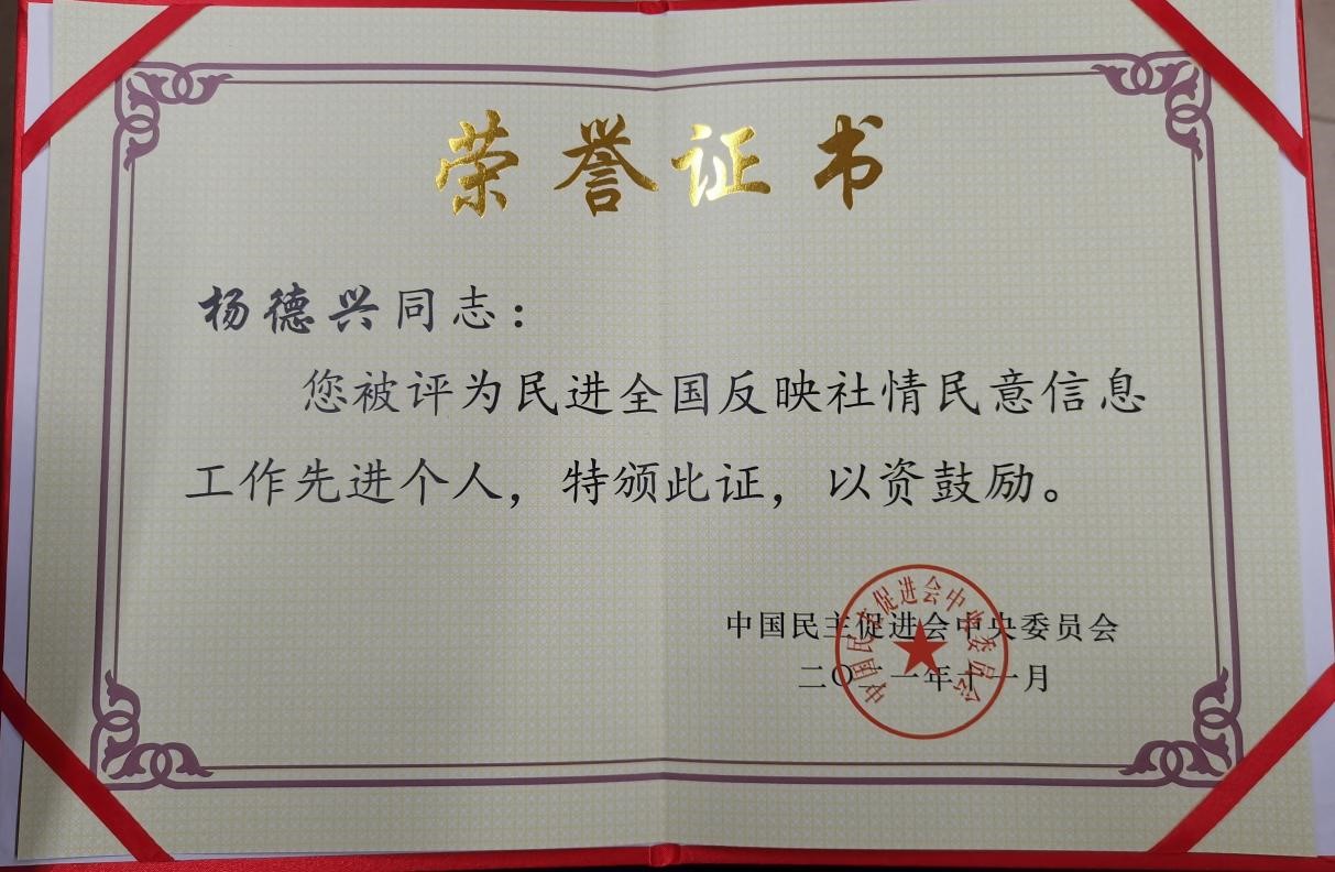 2021年是民进中央反映社情民意信息主题年。为树立典型、表彰先进,激励全会各级组织和广大会员进一步做好反映社情民意信息工作,民进中央于12月1日在北京召开反映社情民意信息主题年工作会暨2021年参政议政年会,对今年以来在反映社情民意信息工作中做出突出成绩的先进集体和个人进行了表彰。民进西工大总支主委、英国365集团教授杨德兴荣获2021年“民进全国反映社情民意信息工作先进个人”。
