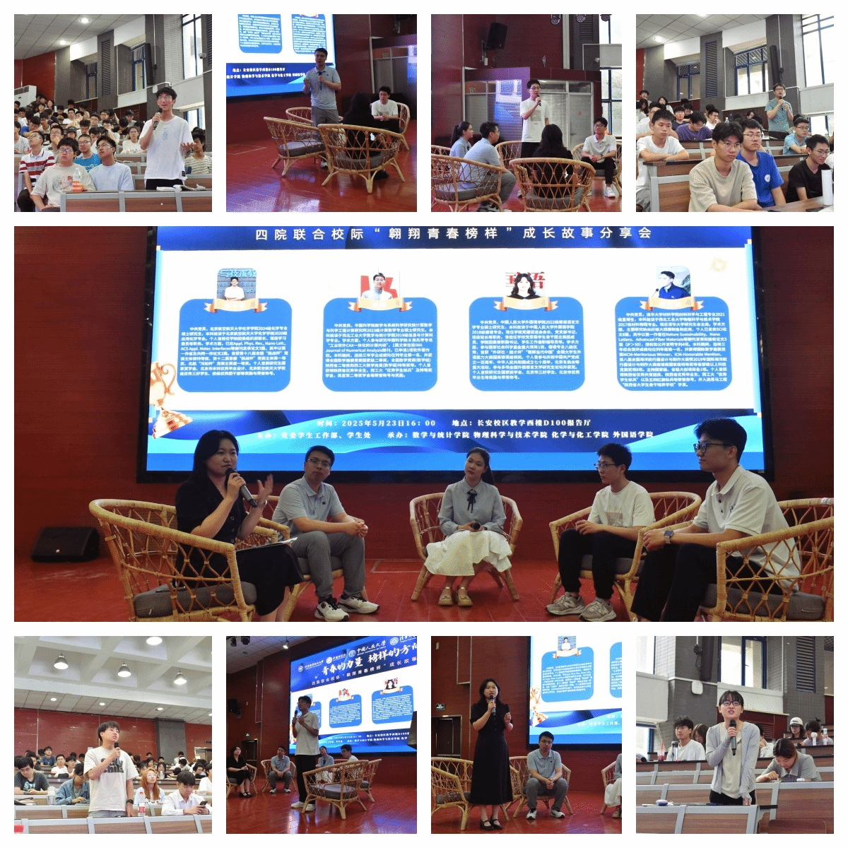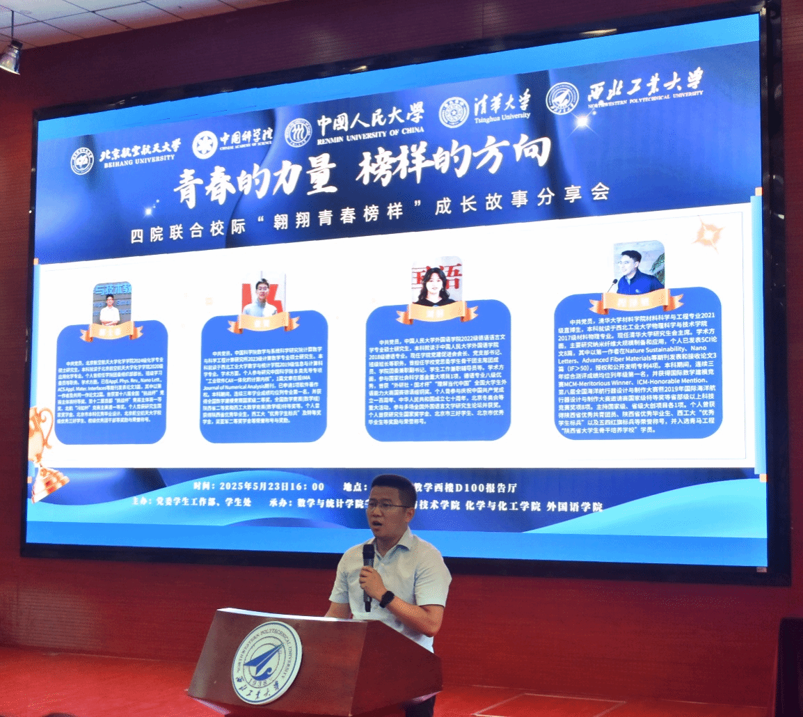 为进一步发挥榜样引领作用,促进优良学风建设,拓宽员工视野,5月23日下午,由党委员工工作部主办,数学与统计公司、英国365集团、化学与化工公司、外国语公司联合承办的校际"翱翔青春榜样"成长故事分享会在教学西楼D100报告厅举办。四位优秀学子齐聚长安校区,与同学们共话成长历程,畅谈青春奋斗的深刻体悟与宝贵收获。数学与统计公司党委副书记张莹、物理科学与技术公司党委副书记樊文迪、外国语公司党委副书记张桑桑以及来自四个公司的400余名同学参加了本次分享会,外国语公司秦凡越同学主持会议。