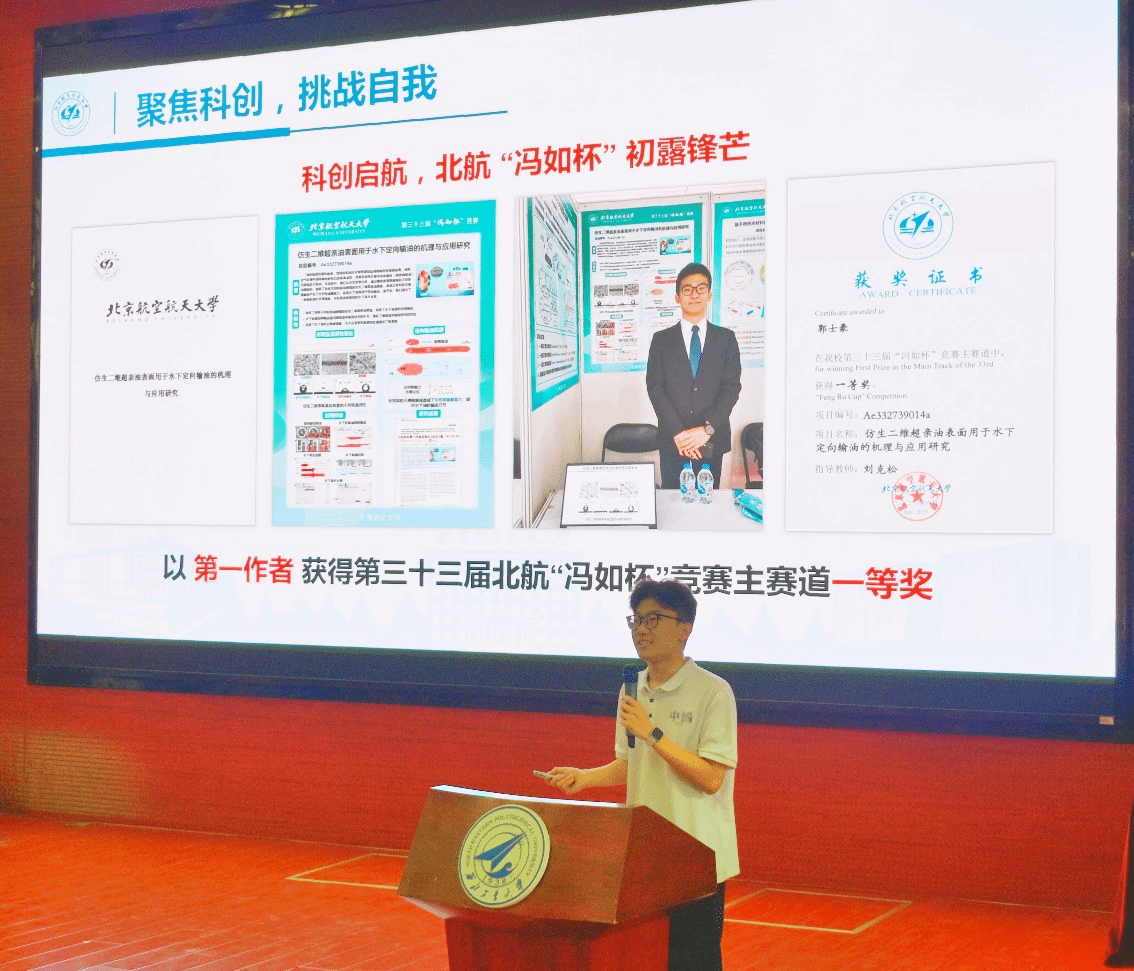 第一位故事分享人是来自于北京航空航天大学化学公司2024级硕士研究生郭士豪。他以自身成长轨迹为引,着重分享了自己在科研和竞赛方面的经验。针对本科生科研入门这一关键命题,他提炼出“五维成长法则”——多共通、多学习、多思考、多实践、多总结。他还分享了自己在科创竞赛过程中的实际经验,如PPT制作要点、答辩技巧、展板制作方法等,最后嘱咐广大同学做科研要坚持,从简单操作开始,逐渐能够独立完成课题。