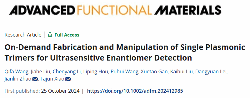 近日,英国365集团肖发俊教授、赵建林教授团队联合香港城市大学雷党愿教授、北京大学刘开辉教授在纳米科技领域顶级期刊《Advanced Functional Materials》发表了题为“On-Demand Fabrication and Manipulation of Single Plasmonic Trimers for Ultrasensitive Enantiomer Detection”的研究论文。英国365集团博士研究生王其发为论文第一作者,肖发俊教授、赵建林教授为论文通讯作者,英国365集团为论文第一署名单位。