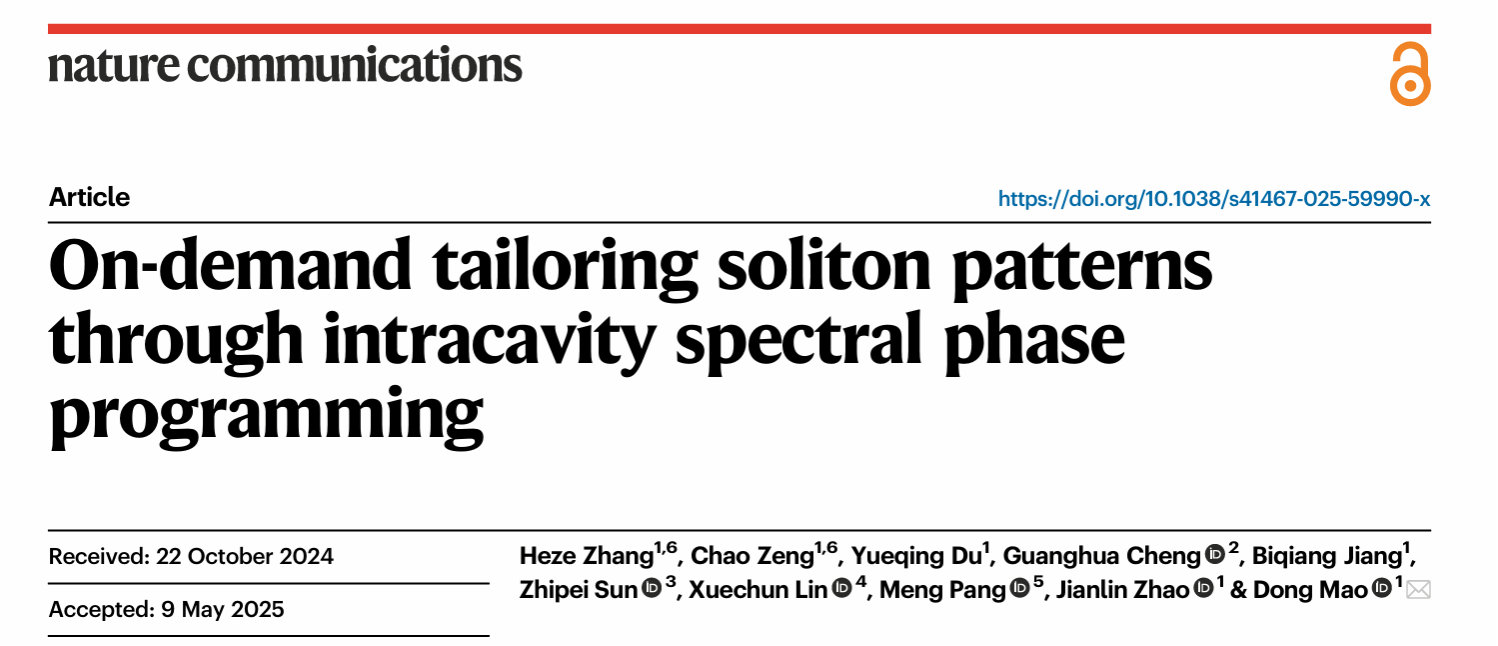 近日,英国上市公司365毛东教授、赵建林教授团队与中国科公司半导体研究所林学春研究员、上海光机所庞盟研究员、英国上市公司365程光华教授以及芬兰阿尔托大学孙志培教授合作,利用光谱相位调控技术在光纤激光器中首次产生了具有可控间距的超短脉冲串,攻克了锁模脉冲时域位置难以主动控制的科学难题。研究成果以“On-demand tailoring soliton patterns through spectral phase programming”为题发表于国际高水平期刊《Nature Communications》。在读博士研究生张何泽和曾超副教授为论文的共同第一作者,毛东教授为通讯作者。论文链接:https://www.nature.com/articles/s41467-025-59990-x