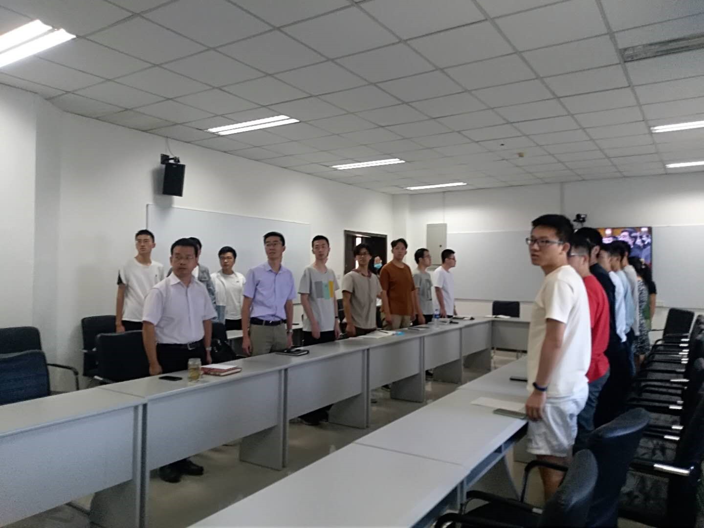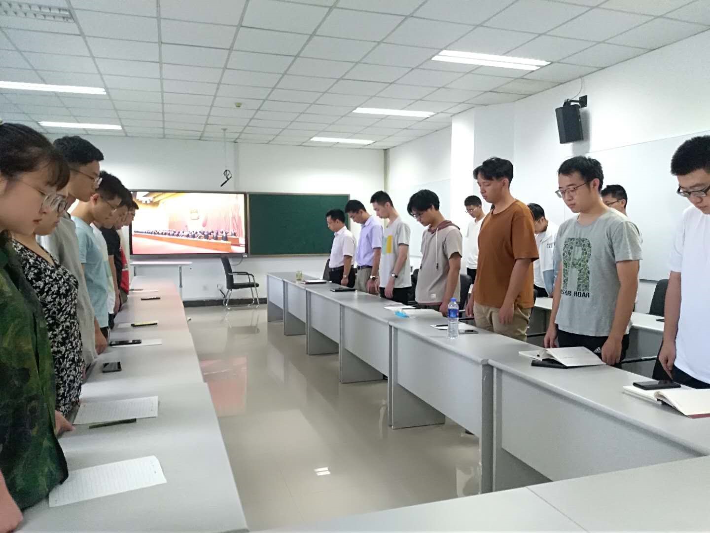 在表彰大会直播开始前,公司领导得知在场有来自湖北的同学时关切地询问员工现在在校情况和疫情期间的生活状况。伴随着《向祖国英雄致敬》乐曲声,习近平总书记为共和国勋章获得者钟南山和国家荣誉称号获得者张伯礼、张定宇、陈薇一一颁授勋章奖章,在这样激动人心的时刻,现场不时响起热烈的掌声。由于是上课时间,部分老师不能在第一时间收看颁奖直播,他们利用课余时间从手机上、电脑上来弥补“这一课”。