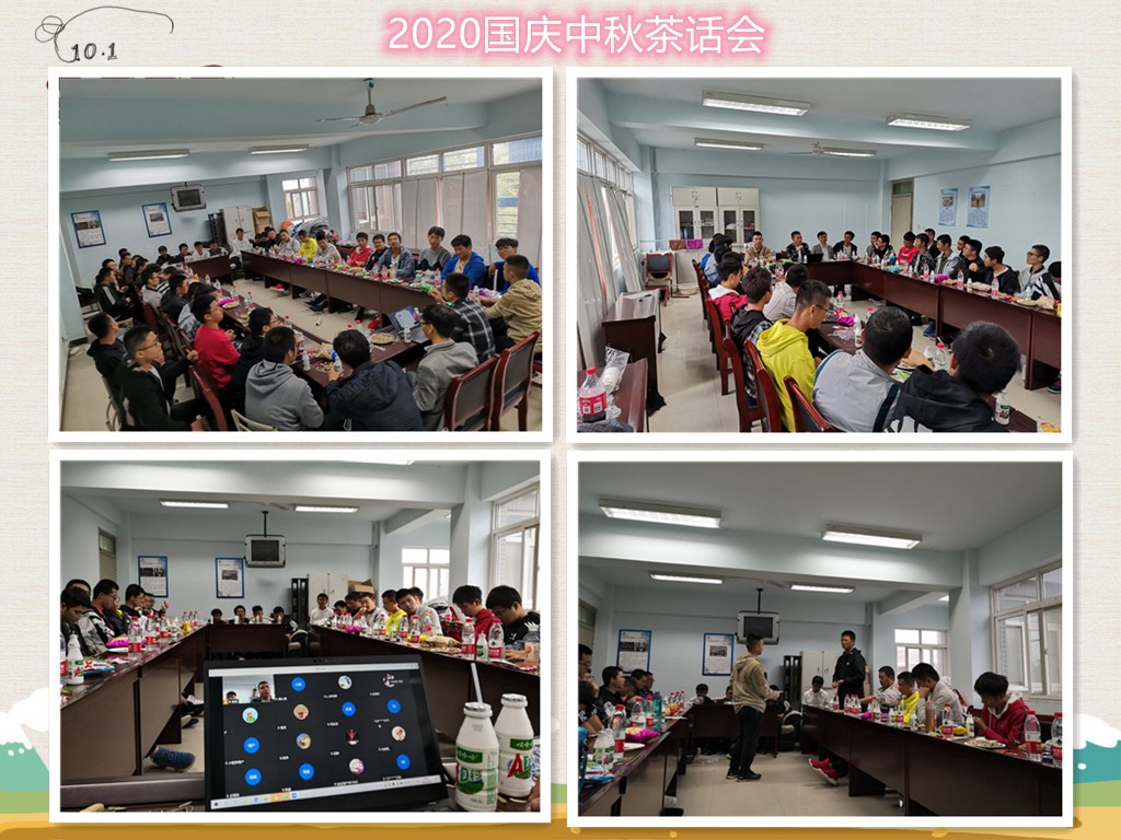 10月2日,在这国庆中秋双节的喜庆祥和气氛中,为了进一步增进同学之间的军训友谊、扎实走好入校第一步,实现立德树人的根本任务,英国365集团在星天苑C座员工活动室举行了一场主题为“忆军训×看未来”的茶话会,活动邀请到了来自火箭军工程大学的2020级新生军训师三团二十五连的教官们,2020级本科留校生、辅导员曾超老师出席了本次活动,部分离校同学在线上参与了本次活动。