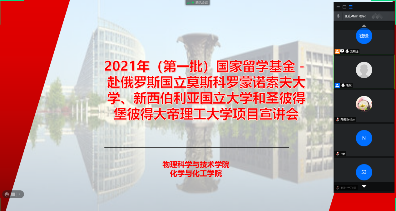 首先,毛东副经理对各位老师、同学在假期期间能够积极参与本次线上宣讲会表示感谢,并重点介绍了数理化基础前沿与交叉学科人才培养项目的基本情况。在国家留学基金委资助下,与俄罗斯3所顶尖高校开展深度合作,选派相关学科方向本、硕、博员工深造和联合培养。该项目覆盖面广、合作高校水平高,对提升人才培养的国际化水平具有重要意义。