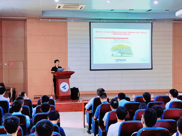 在报告中,仇成伟教授由“1+1>2”的趣味观点出发,回顾了等离激元和电介质超表面近年来的一些研究成果,并着重介绍单层过渡金属硫化物和层状二维材料如何与经典超表面配合使用,达到操控和产生新型光场的目的,例如通过两者的协同配合实现零暗电流和双极半金属光电探测器、单原子层厚度的超透镜等。仇成伟教授的报告紧扣光学领域前沿问题,从科学前沿热点、资源利用发展的角度,结合自己多年来的科学研究成果,以详实的实验数据和深入的分析,阐述了他对界面工程、光电器件、光与物质相互作用等问题的理解和认识,并对未来的发展趋势作出了展望。